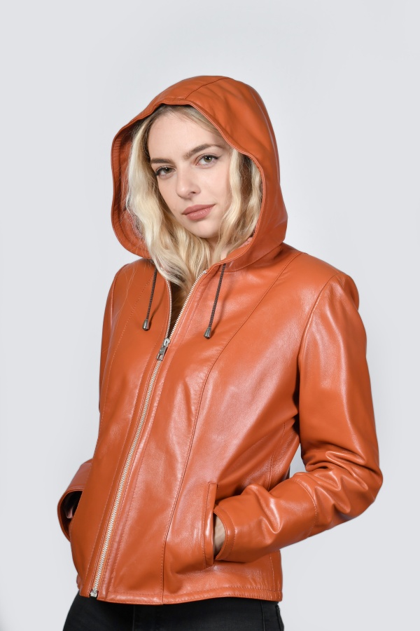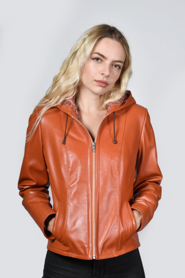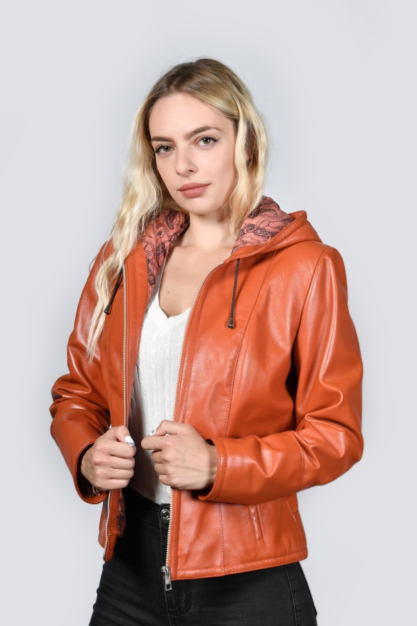 Δερμάτινο biker jacket,με φερμουάρ, κοφτές τσέπες,με κουκούλα και κορδόνι περίσφυξης.