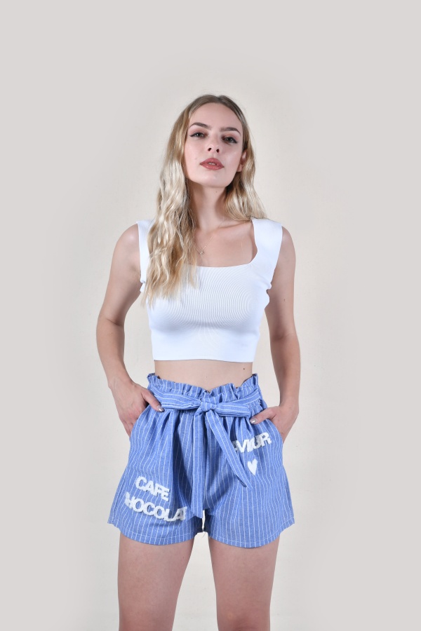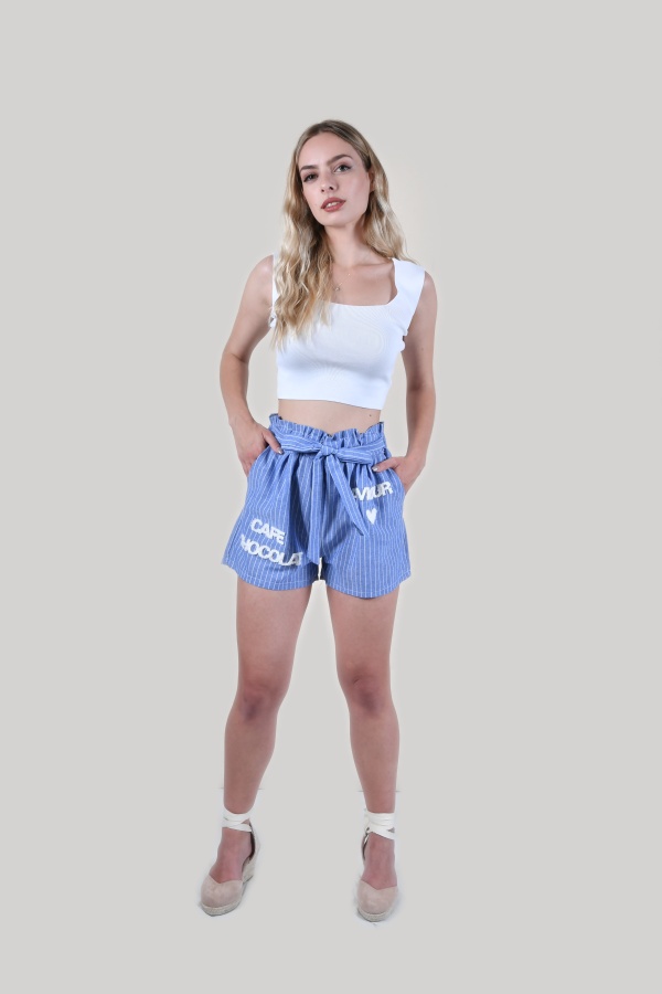 Γυναικείο σορτσάκι ψηλόμεσο με ρίγες μπλέ και λεύκες και με υφασμάτινη ζώνη που δένει στην μέση